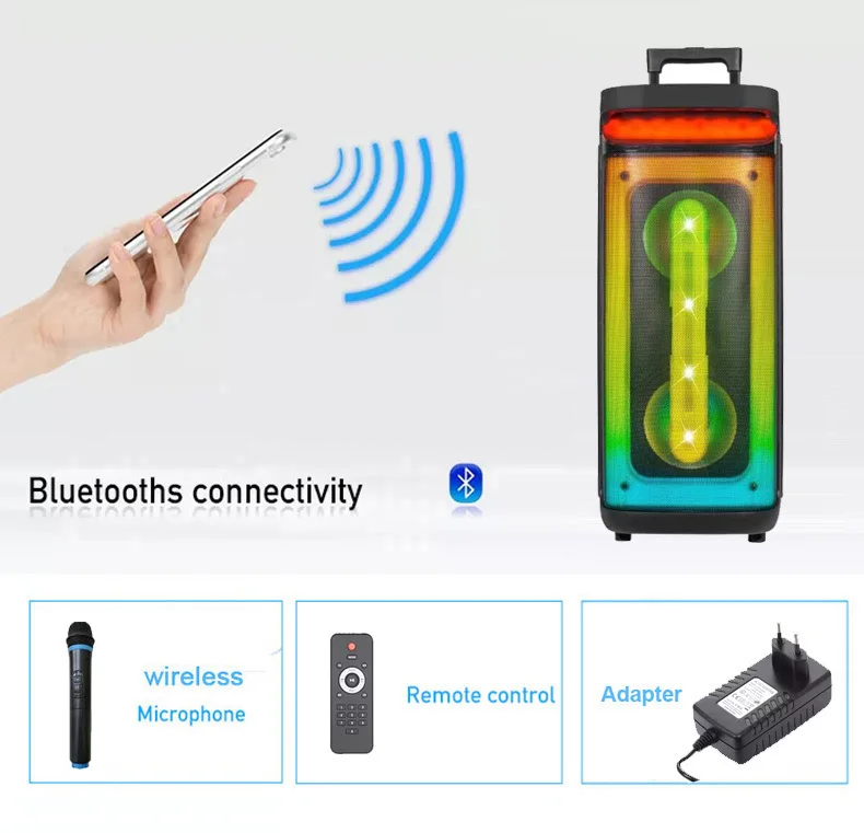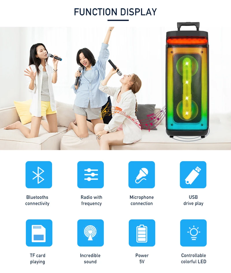 2. Высокая мощность, динамик со светодиодными разноцветными огнями, огни будут прыгать вместе с музыкой. 3. Встроенный стерео и стерео на 360 °. 4. Аккумулятор большой емкости, длительное время автономной работы и непрерывное наслаждение музыкой. 5. FM-радио позволяет свободно слушать радио. 6. Поддержка музыкальных файлов формата MP3, WMA, WAV, FLAC, ape. 7. Поддержка TF-карты или misro SD-карты до 32 г. 8. Поддержка USB подключи и играй. 9. Поддержка внешнего MP3 / MP4/функции аудиовхода компьютера (aux) 10. Функция TWS, вы можете подключить два динамика для синхронизации с телефоном. 11. Простое управление клавишами, вы можете нажимать кнопку, чтобы включить/выключить, воспроизвести/паузу, переключить режим, пропустить песни, отрегулировать громкость и т. Д. 12. Bluetooth 5,0, совместим со всеми устройствами Bluetooth. 13. Динамик оснащен беспроводными микрофонами, так что вы можете выйти из линии и включить режим KTV в любое время и в любом месте.
