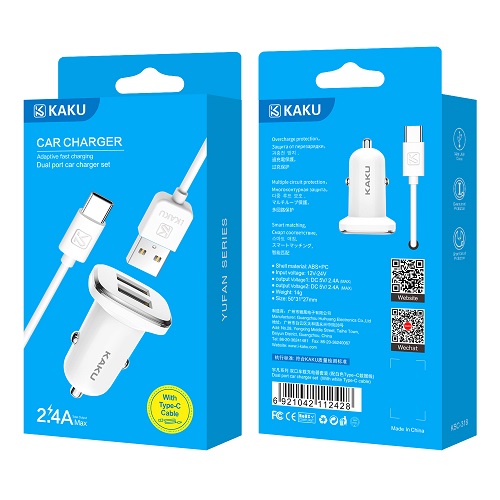 Автомобильное зарядное устройство KAKU KSC-318. Максимальная выходная мощность составляет 2,4А. Данное АЗУ обладает защитой от перенапряжения и перегрузки электричества. Это защитит устройство, которое находится на зарядке, от поломки.