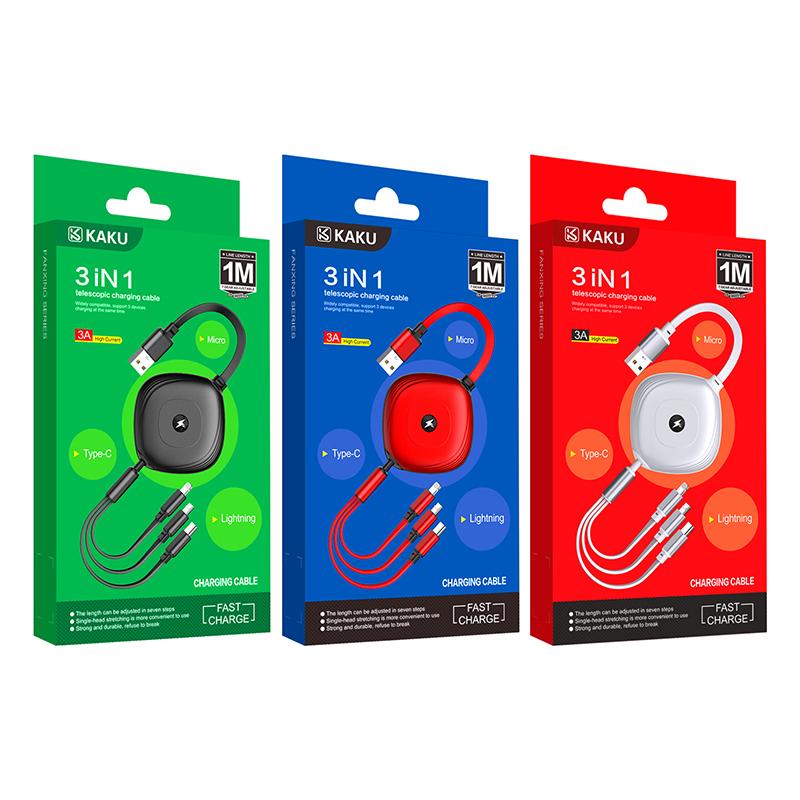 Кабель KAKU KSC-460 с разъемом Lightning, Micro, Type C. Прочный кабель служит для зарядки. Длина кабеля регулируется. Максимальный проводимый ток 3А. Специальная оболочка предотвращает окисление и ржавчину. Надежная оплетка защищает от механических повреждений.