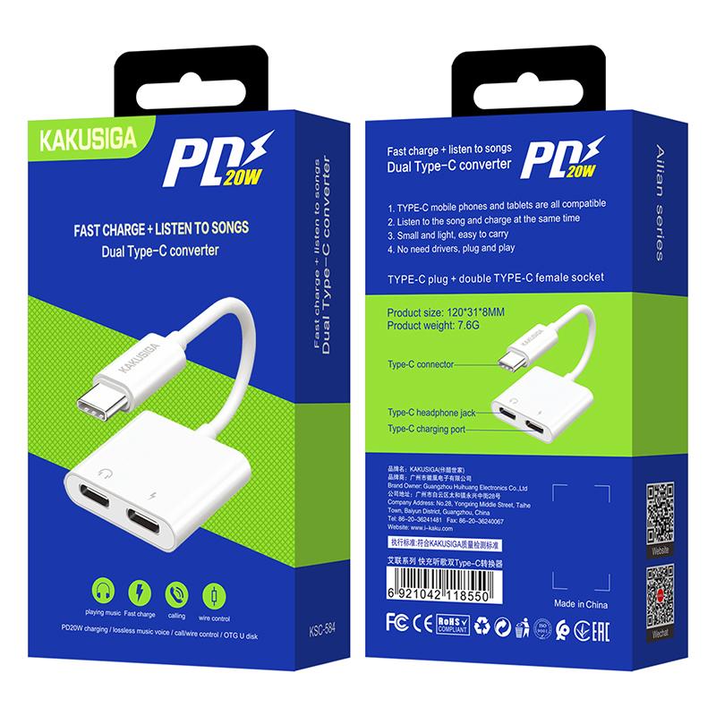 Кабель переходник с 2мя Type-C Kaku KSC-584 для зарядки и одновременного прослушивания музыки.