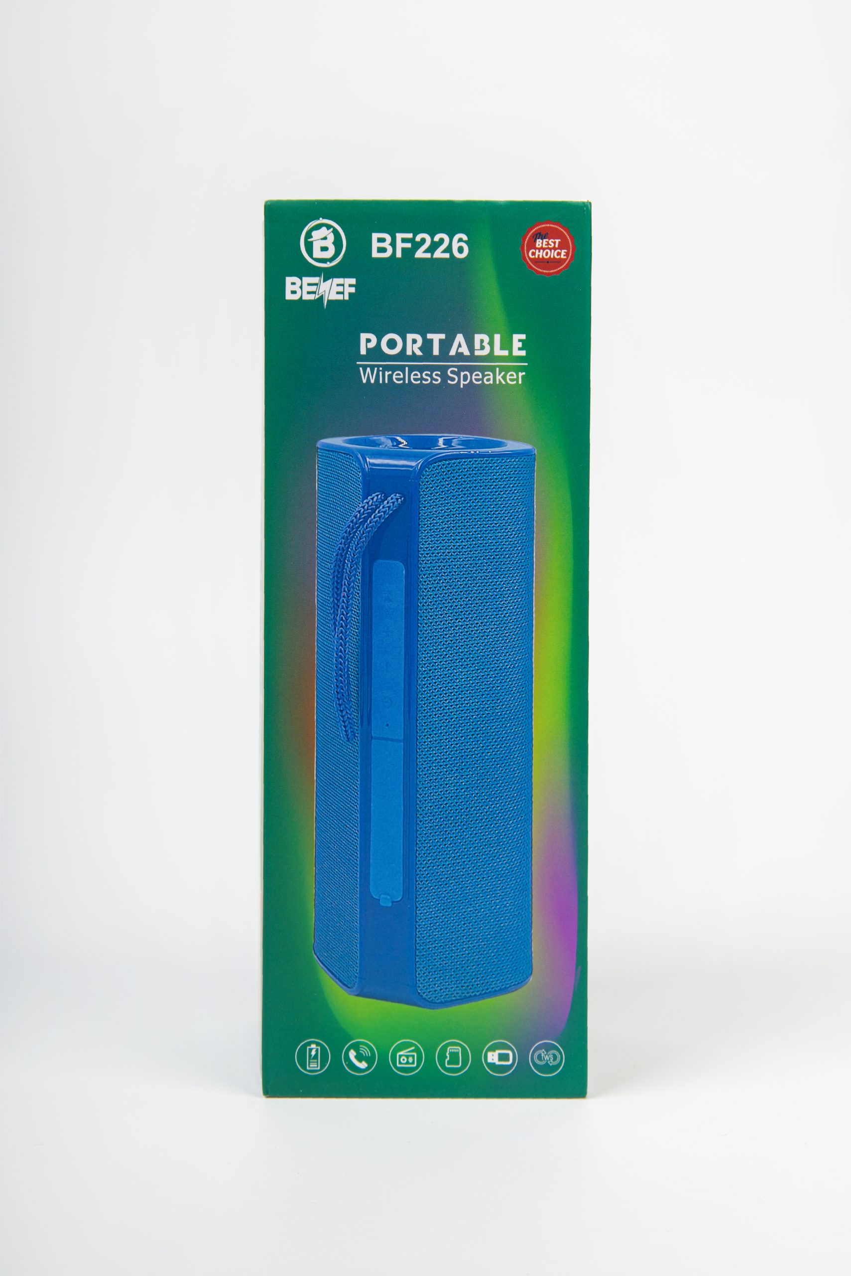 Портативная колонка BENEF BF-226 с поддержкой радио и блютуз. Здесь присутствуют кнопки подключения по Bluetooth, уменьшения/увеличения громкости, включения/выключения устройства, а также кнопка для активации следующего трека, постановки композиции на паузу. Для дополнительного удобства есть слоты для подключения AUX, USB и Micro SD. В упаковке имеется кабель для зарядки и AUX кабель.