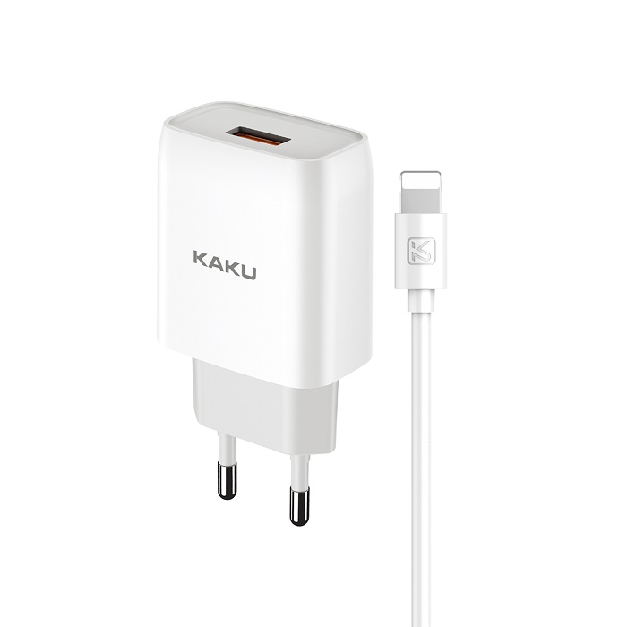 Сетевое зарядное устройство KAKU KSC-396. Максимальная выходная мощность составляет 2,4А. Данное СЗУ обладает защитой от перенапряжения и перегрузки электричества. Это защитит устройство, которое находится на зарядке, от поломки. Сам корпус сделан из огнестойкого прочного пластика. Имеет 1 выход USB. В комплекте так же идет кабель Lightning длиной 1 метр.