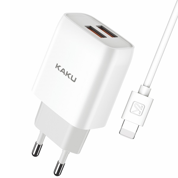Сетевое зарядное устройство KAKU KSC-397. Максимальная выходная мощность составляет 2,4А. Данное СЗУ обладает защитой от перенапряжения и перегрузки электричества. Это защитит устройство, которое находится на зарядке, от поломки. Сам корпус сделан из огнестойкого прочного пластика. Имеет 2 выхода USB. В комплекте так же идет кабель Lightning длиной 1 метр.