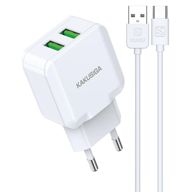 Сетевое зарядное устройство KAKU KSC-414. Максимальная выходная мощность составляет 2,4А. Данное СЗУ обладает защитой от перенапряжения и перегрузки электричества. Это защитит устройство, которое находится на зарядке, от поломки. Сам корпус сделан из огнестойкого прочного пластика. Имеет 2 выхода USB. В комплекте так же идет кабель Type-C длиной 1 метр.